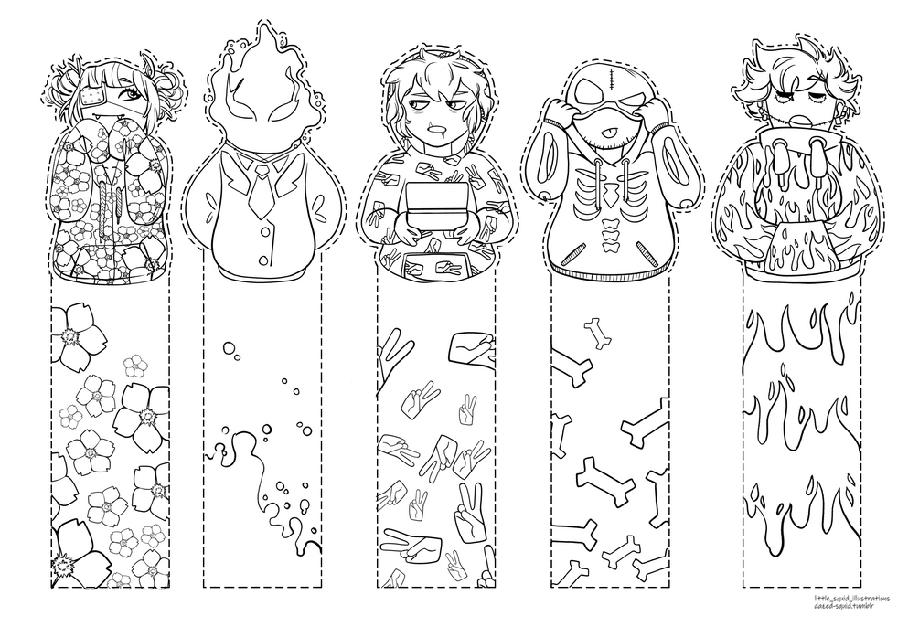 Featuring Toga, Kurogiri, Shigaraki, Twice, and Dabi. Print them out and color traditionally or download the transparent .png to color digitally. Tag on Instagram me if you post them @little_squid_illustrations and I'll share them to my story!